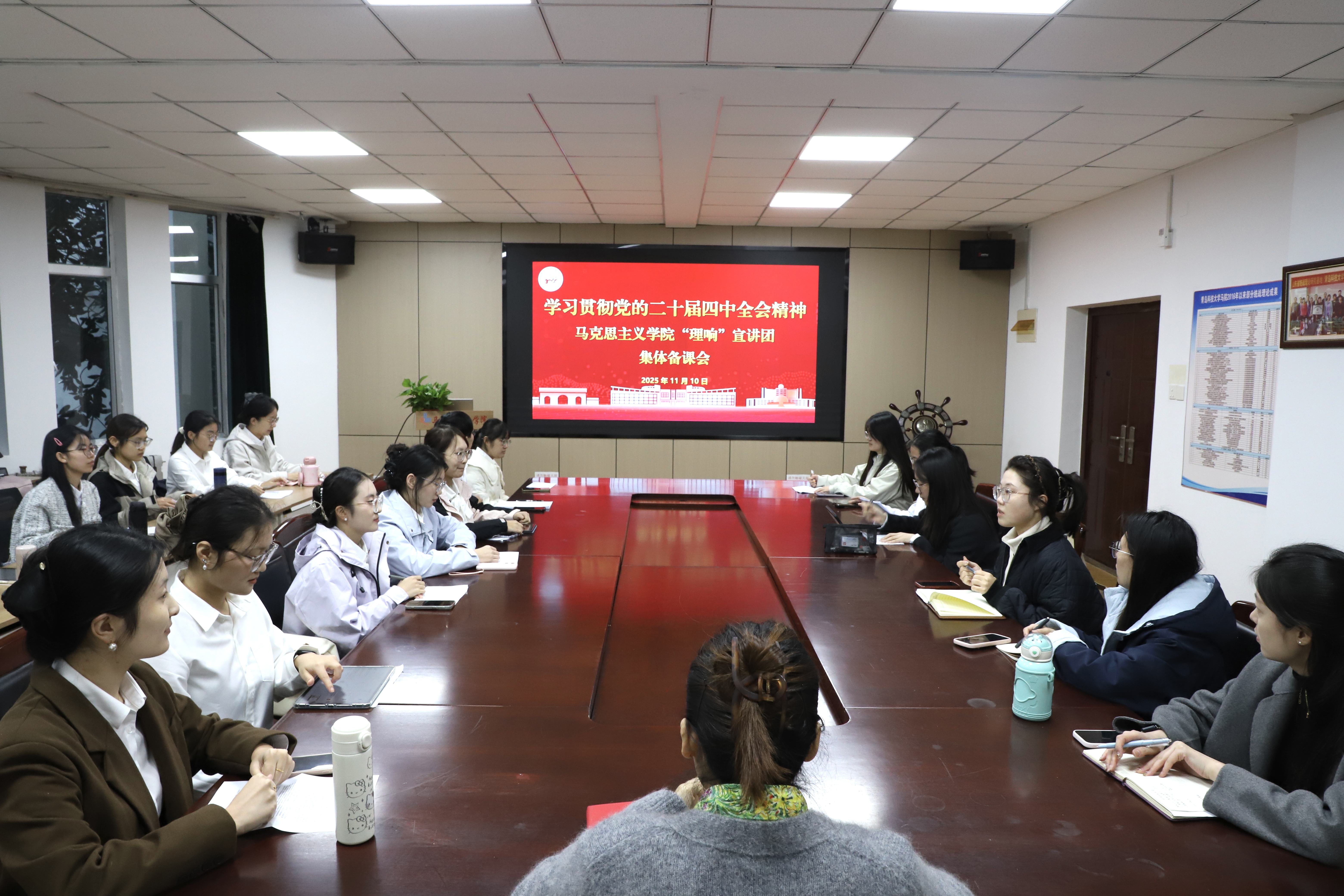 11月10日下午,马克思主义学院“理响”宣讲团学习贯彻党的二十届四中全会精神集体备课会在2010室举行。会议由宣讲团团长郭钰主持,学生工作办公室主任郭佩佩出席本次活动,宣讲团全体成员参会。